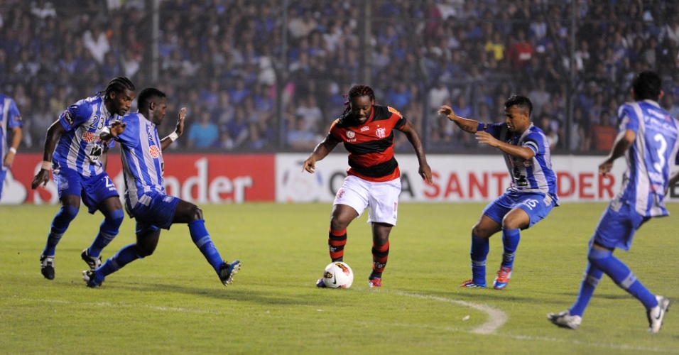 Foto 9 de 25 - Vágner Love tenta passar pela marcação na partida entre Emelec e Flamengo Alexandre Vidal/Fla Imagem