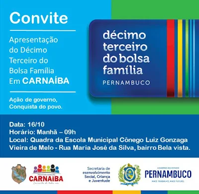Apresentação do 13º do Bolsa Família Pernambuco em Carnaíba será dia 16 de outubro